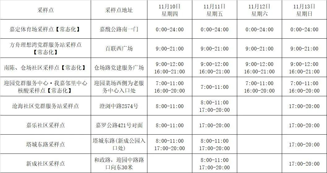 根据全市疫情防控工作要求,为有效降低疫情传播风险,保障辖区居(村)民生命健康安全,街道将于本周四(11月10日)、周日(11月13日)组织开展社区核酸筛查,11月10日采样开始时间为18:30,11月13日采样开始时间为7:00(具体时间以各社区安排为准)。请居(村)民朋友主动参与,应检尽检,确保“不落一户、不漏一人”。居(村)民如7天内无核酸检测记录,其“随申码”将被赋黄码。对“应检未检”并造成疫情传播扩散者,将依法追究相应法律责任。具体安排如下:1.采样时段小区实行封闭管理,采样结束后即解除封闭,无法参与小区核酸筛查的居民,请及时前往街道常态化核酸采样点进行检测,当日开放的常态化核酸检测点位安排见附表。2.沿街商户从业人员、宾旅馆住客等人员主动到就近的常态化采样点参与核酸检测。3.采样期间请规范佩戴口罩、保持2米以上安全距离、做好个人防护。5.特别提醒:所有来沪、返沪人员要第一时间完成“落地检”,主动向所在居(村)、单位报备,实行“三天三检”,且24小时内必须进行一次核酸检测,未按要求完成核酸检测者,其“随申码”将被赋黄码。